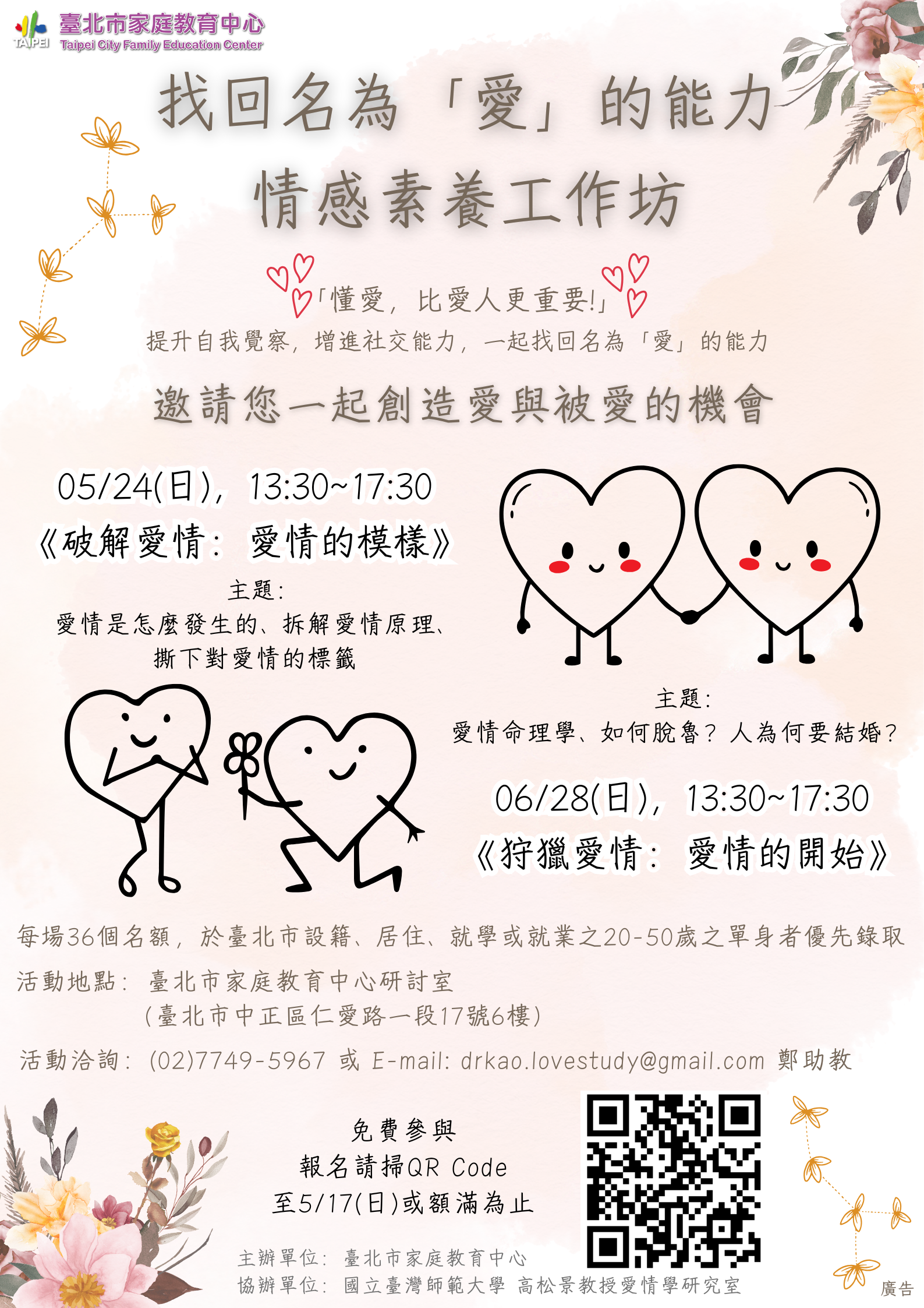 三、「臺北市家庭教育中心115年度『找回 名為「愛」的能力—情感素養工作坊』,於5月24日及6月 28日(星期日)13時30分至17時30分假臺北市家庭教育中 心舉辦,活動名額為36人,歡迎年齡20歲以上至50歲之單身者踴躍報名參加(於本市設籍、居住、就學或就業者為 優先錄取),活動全程免費參與,詳細內容可於中心網站 (https://family.gov.taipei)課程與活動瀏覽及下載, 相關報名問題請寄信E–mail至drkao.lovestudy@gmail. com詢問」。