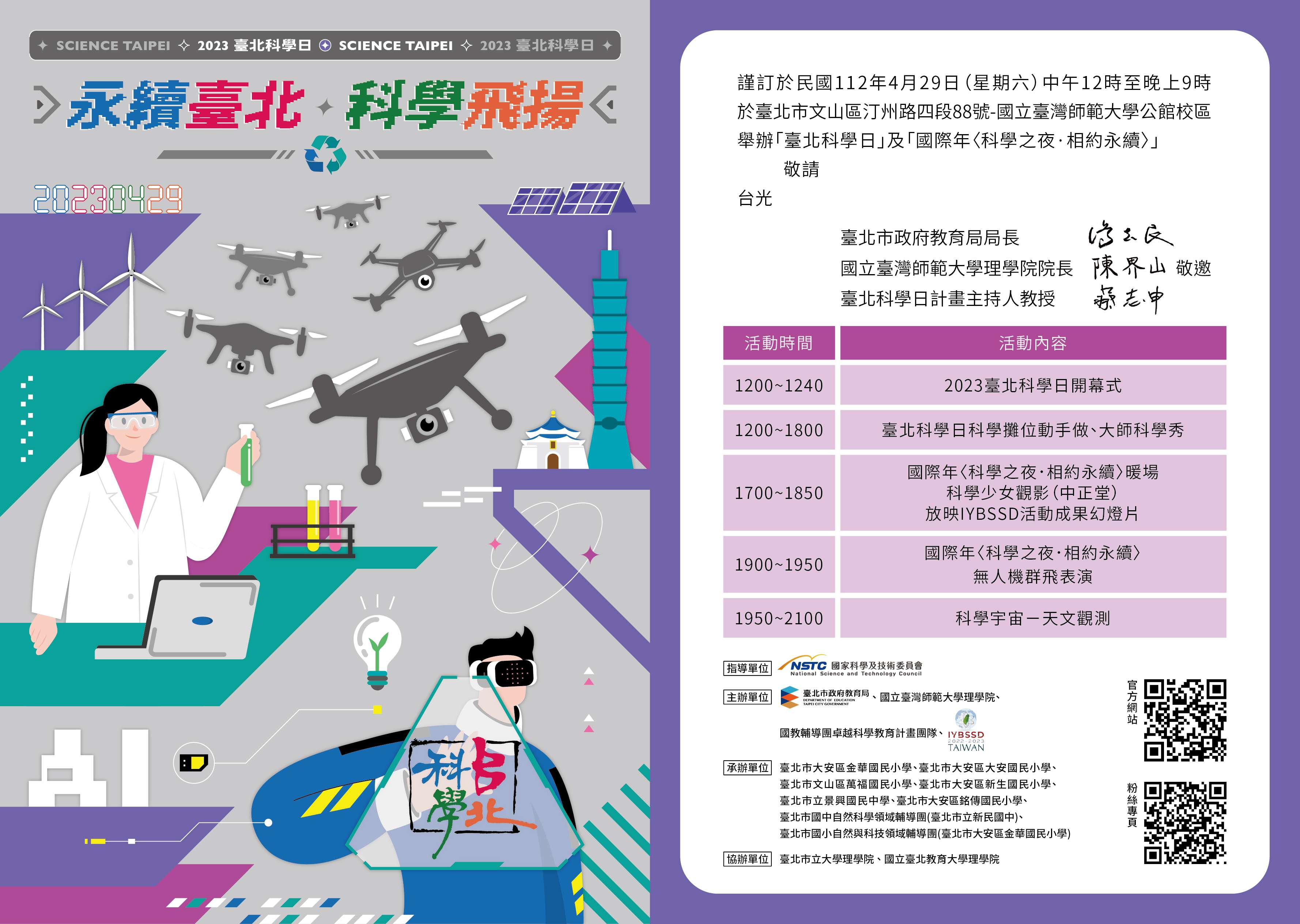 臺北市教育局與國立臺灣師範大學理學院物理學系合作舉辦,本年度將於112年4月29日(星期六)假師大公館校區 辦理科學體驗實作活動,並響應聯合國教育科學及文化組 織「基礎科學促進永續發展國際年」理念,藉本活動「永 續臺北—科學飛揚」之主題,彰顯本市對於推動科學教育 的重視。