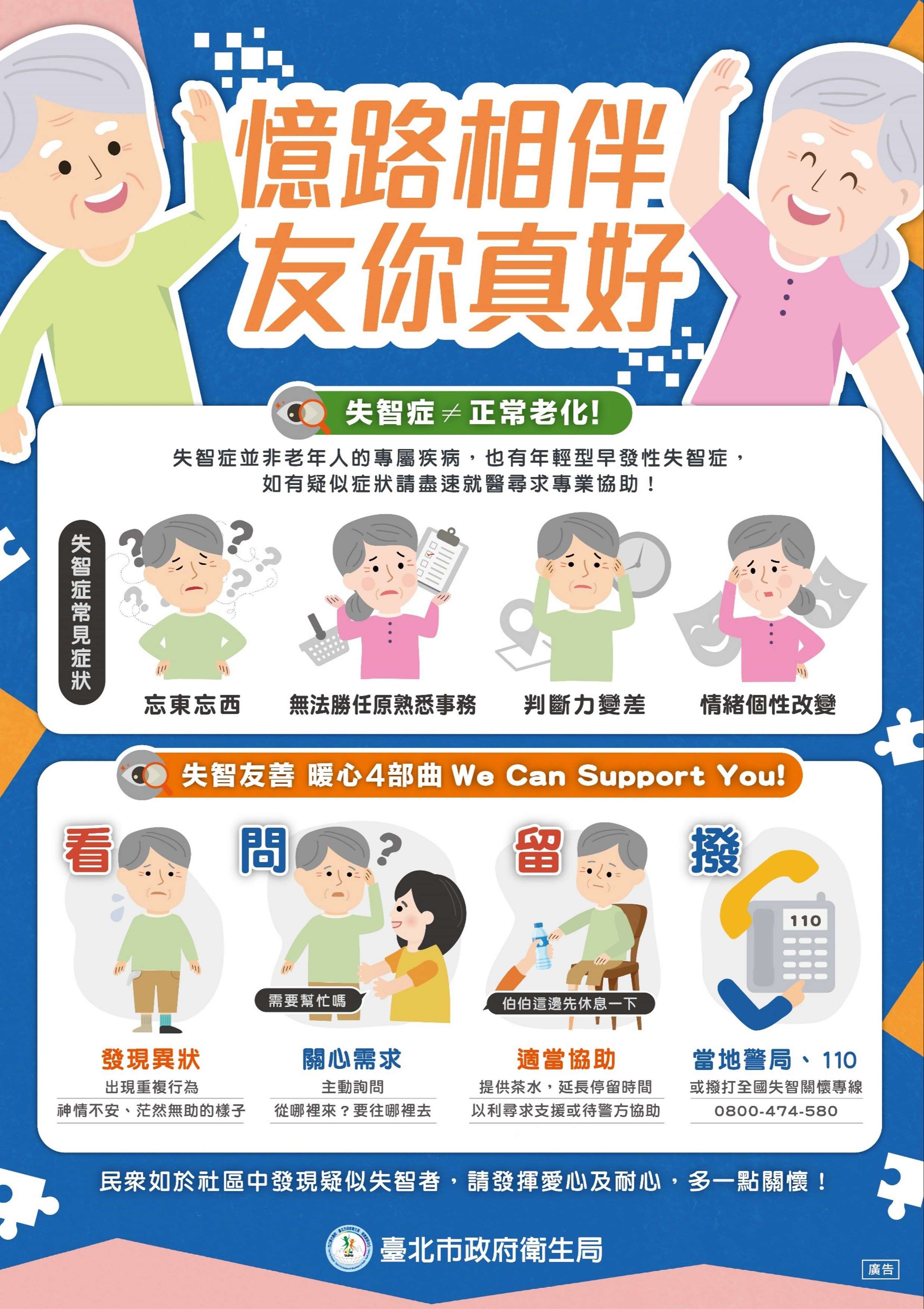 二、本市自111年1月底邁入超高齡社會,推估失智症人口逾4萬 人,為增加市民朋友對失智症認識,市府衛生局製作旨揭 宣導海報,請貴單位協助宣導周知。