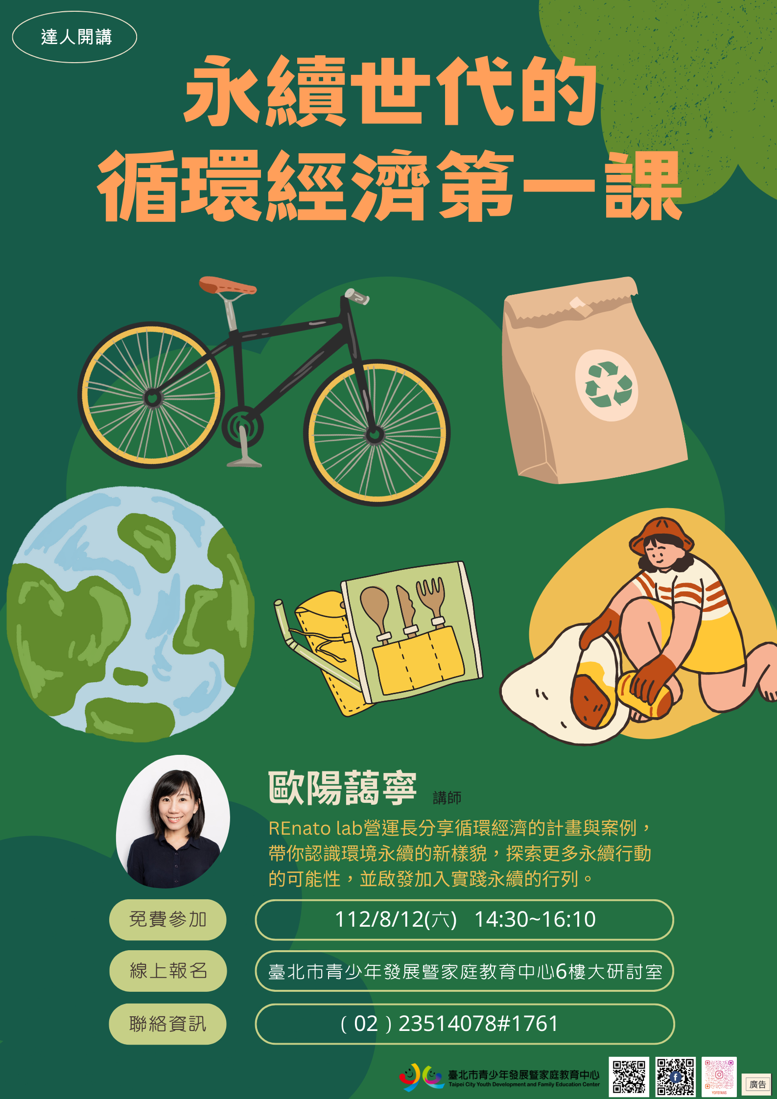 (三)30字:青發家教中心8/12歐陽藹寧開講:永續世代的循 環經濟第一課。活動免費詳官網。