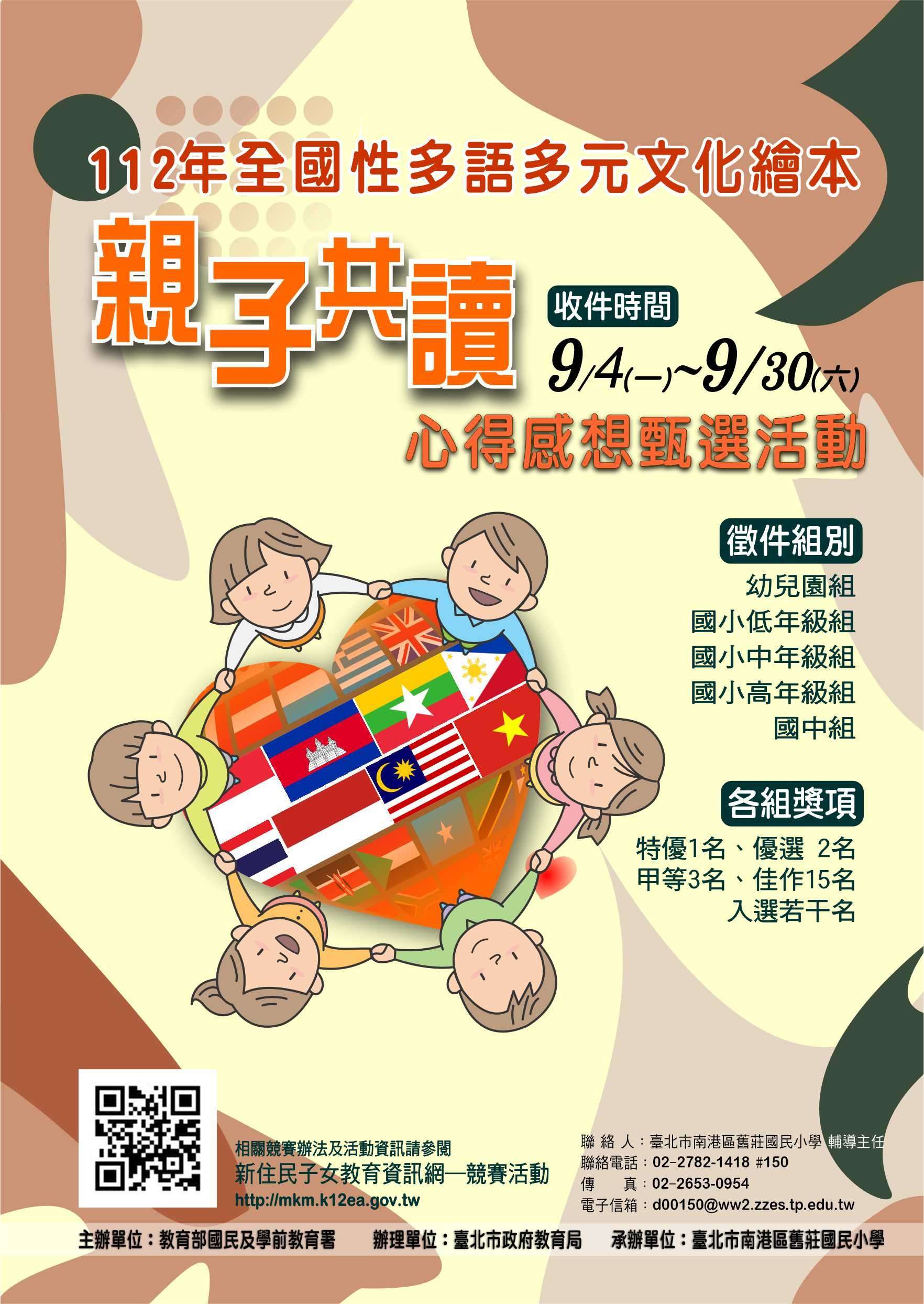 七、檢附112年度全國性多語多元文化繪本親子共讀心得感想甄 選活動計畫及電子海報各1份。