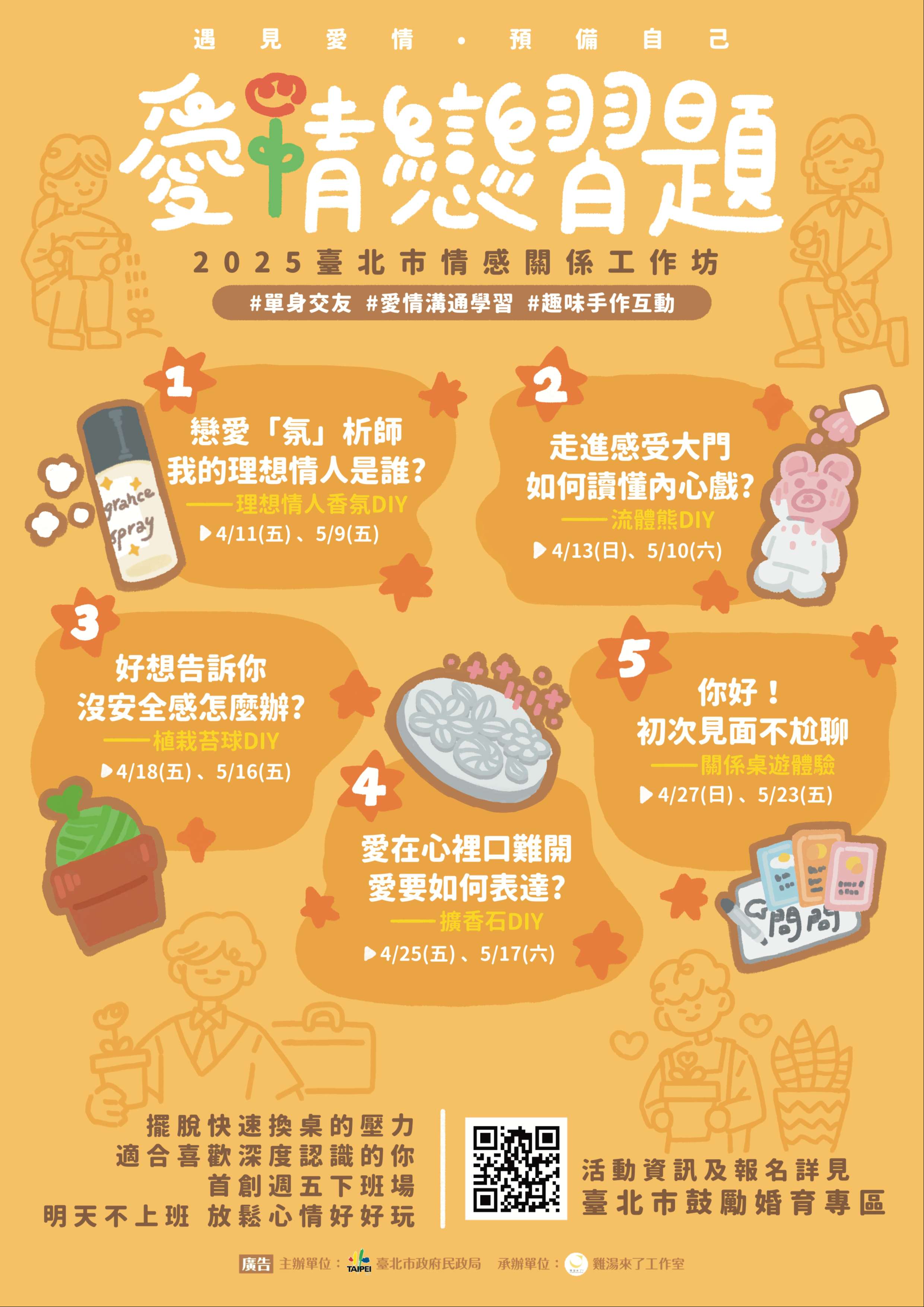 2025臺北市情感關係工作坊3/17開放報名囉!首創週五晚上場!4/11至5/23共10場豐富主題,學習愛情溝通,還可體驗好玩手作植栽苔球、香氛調製,機會難得、把握機會報名!詳情見「臺北市鼓勵婚育專區」(https://loveactually.gov.taipei/)。