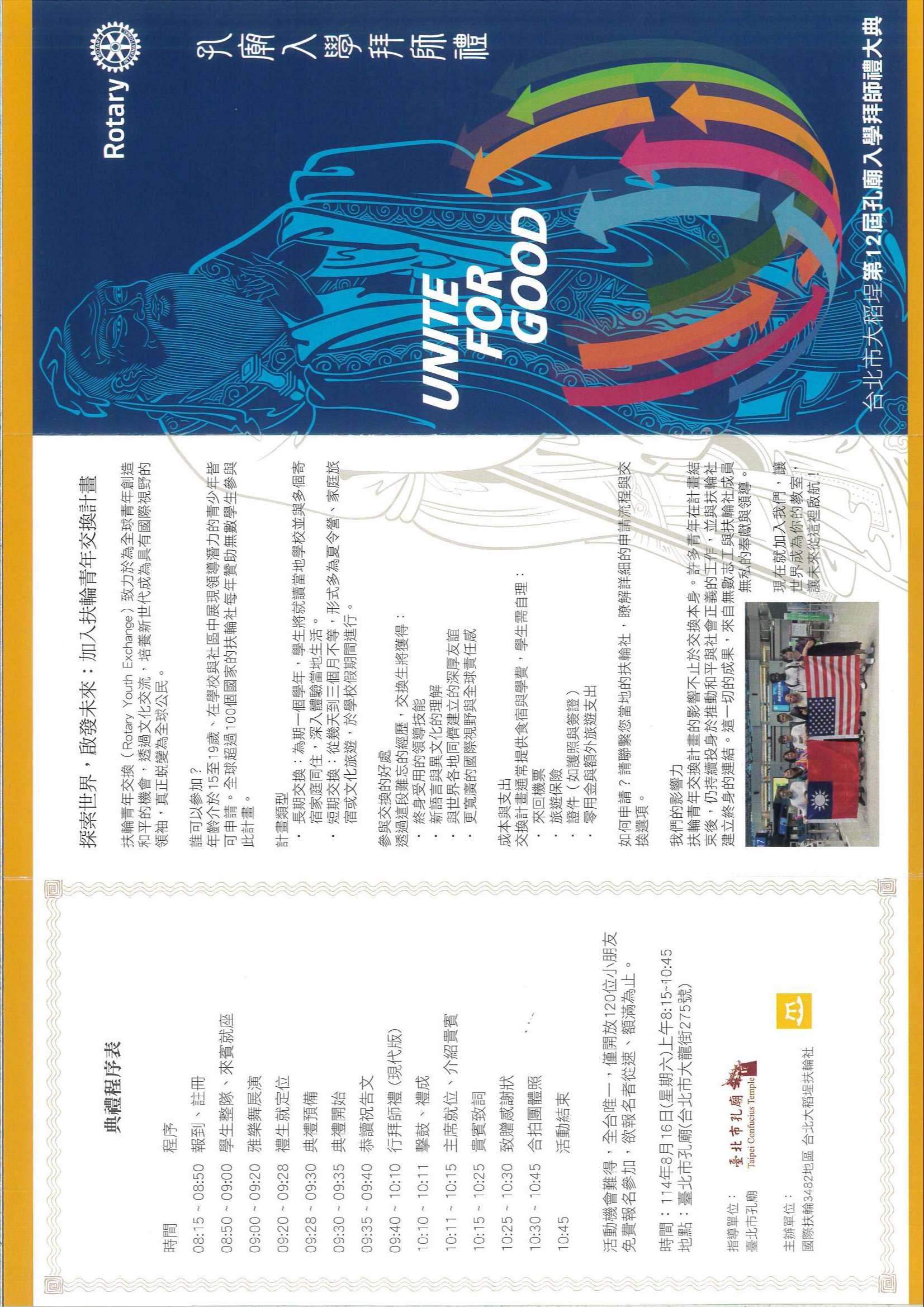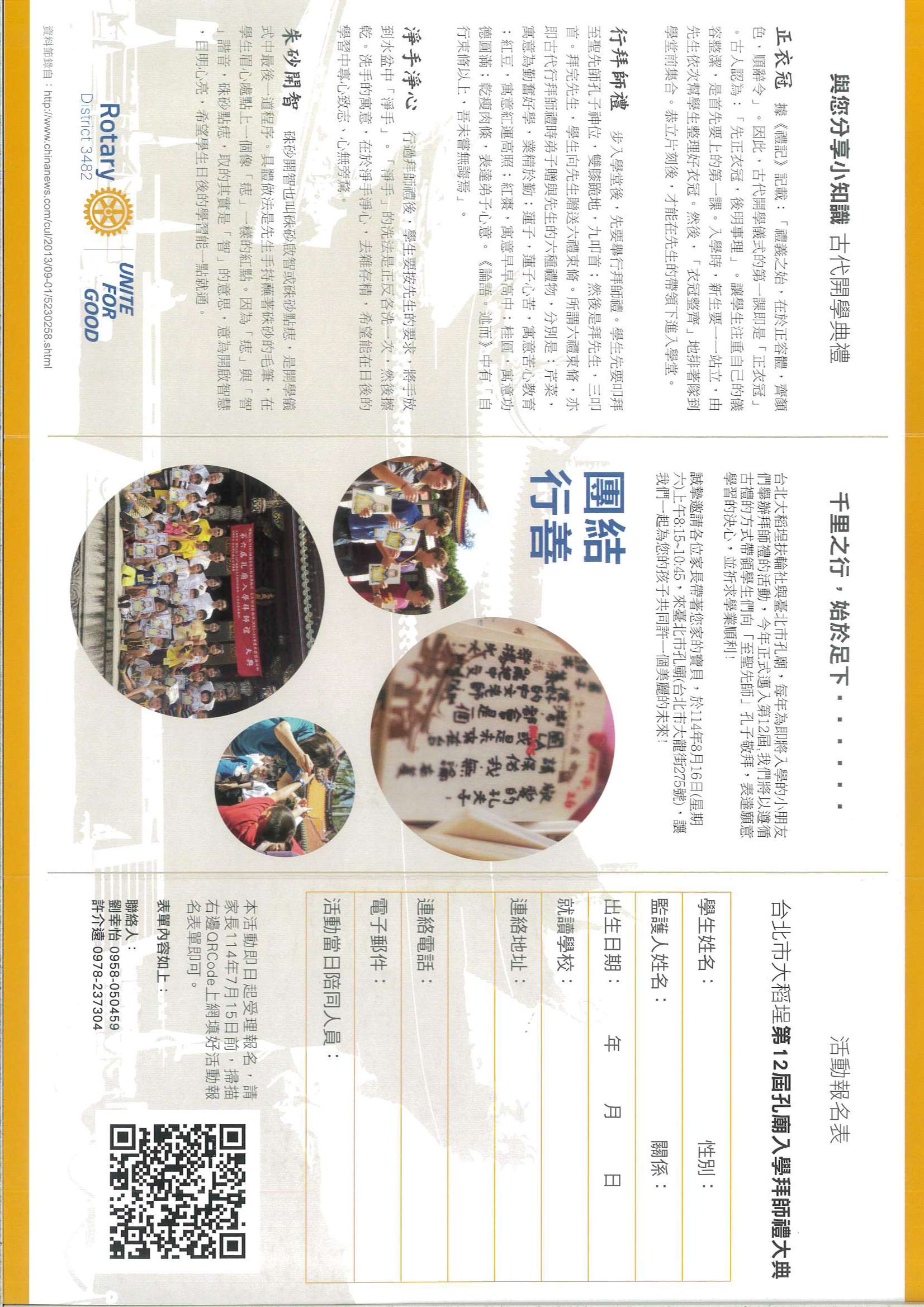 台北市大稻埕扶輪社與臺北市孔廟,為即將入學的小朋友舉辦拜師禮活動,以遵循古禮方式帶領學生向「至聖先師」孔子敬拜,表達願意學習的決心,並祈求學業順利!