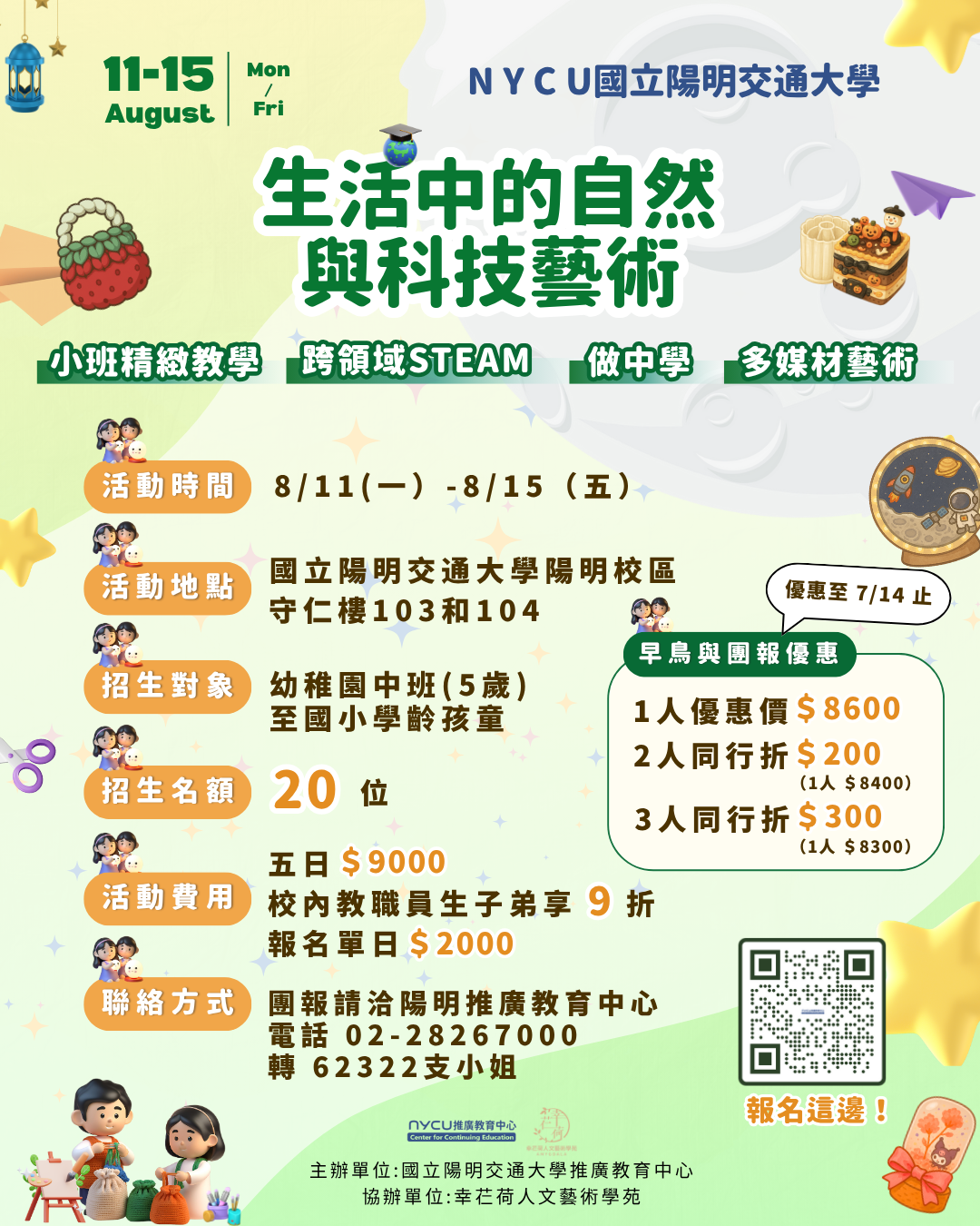 一、國立陽明交通大學推廣教育中心將於114年暑期辦理「生活中的自然與科 技藝術」兒童課程,引導孩童探索自然科技與藝術創作的 樂趣。