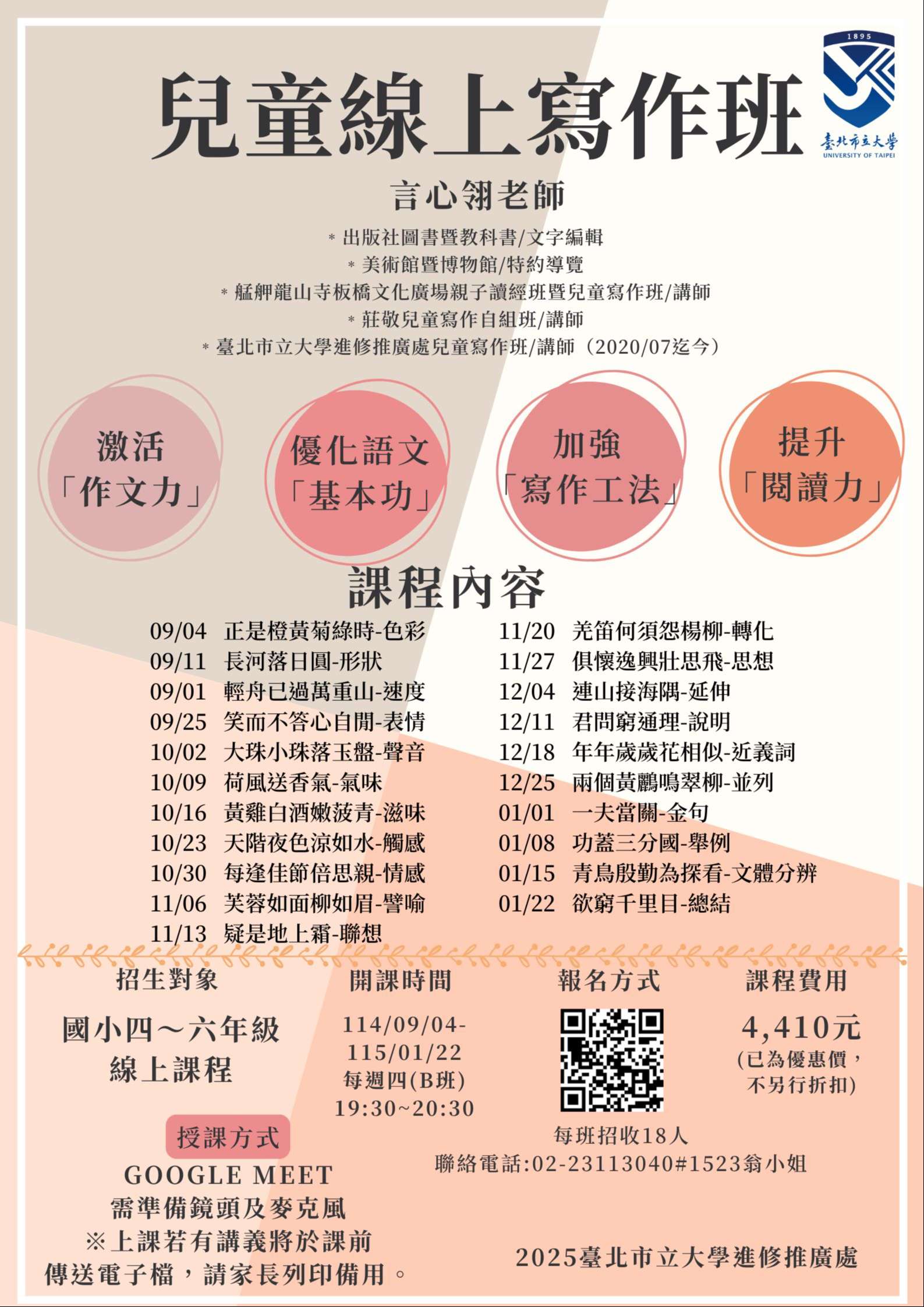 辦理時間:114年9月3日至115年1月22日。招生對象:國小四年級至六年級學生。 報名日期:即日起至114年8月27日止。