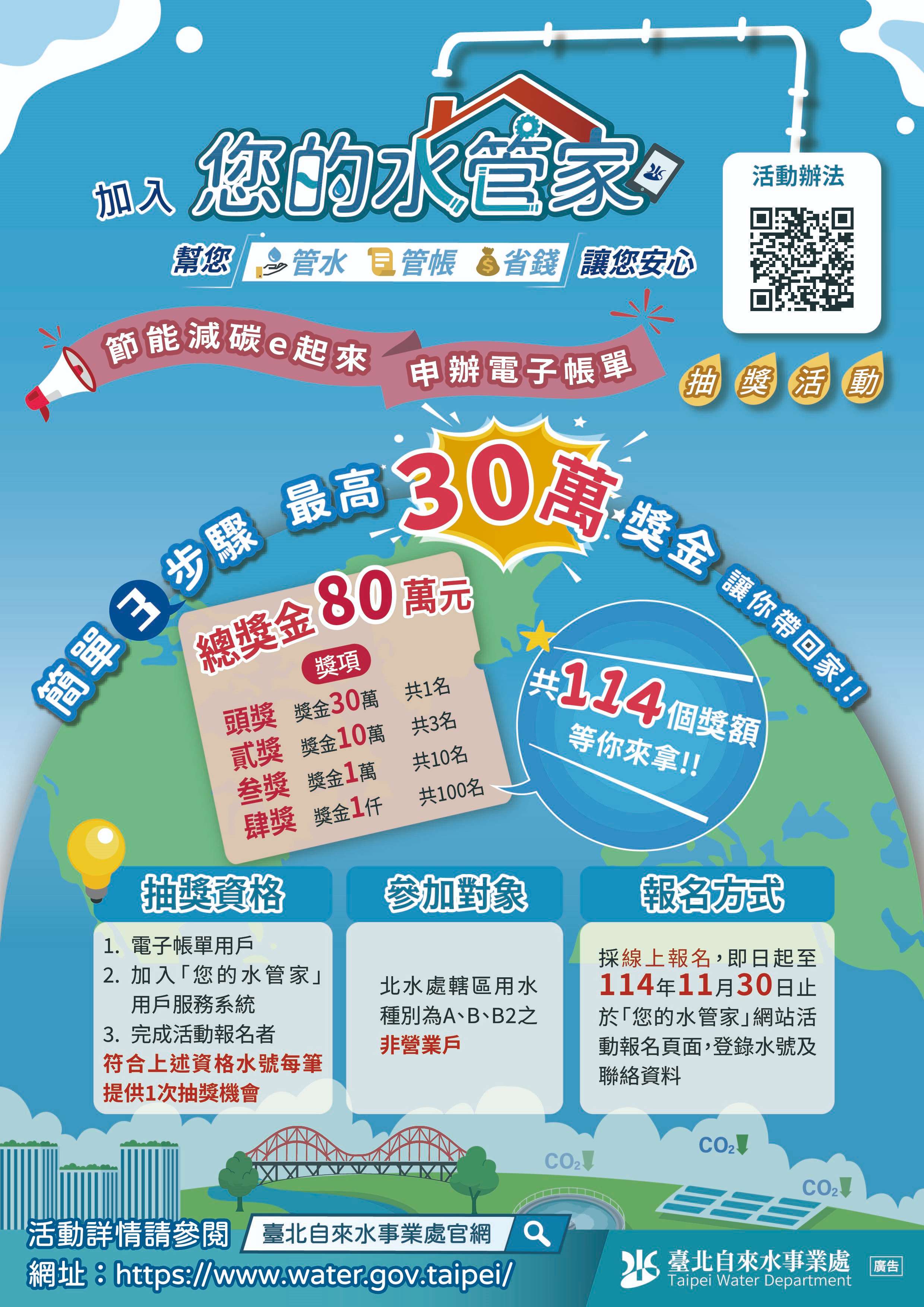 北水處現正舉辦 「水費電子帳單抽獎活動」【最高30萬獎金】等多個獎項,讓你帶回家!心動不如馬上行動,詳情請至北水處官網 https://www.water.gov.taipei瞭解及踴躍報名參加。